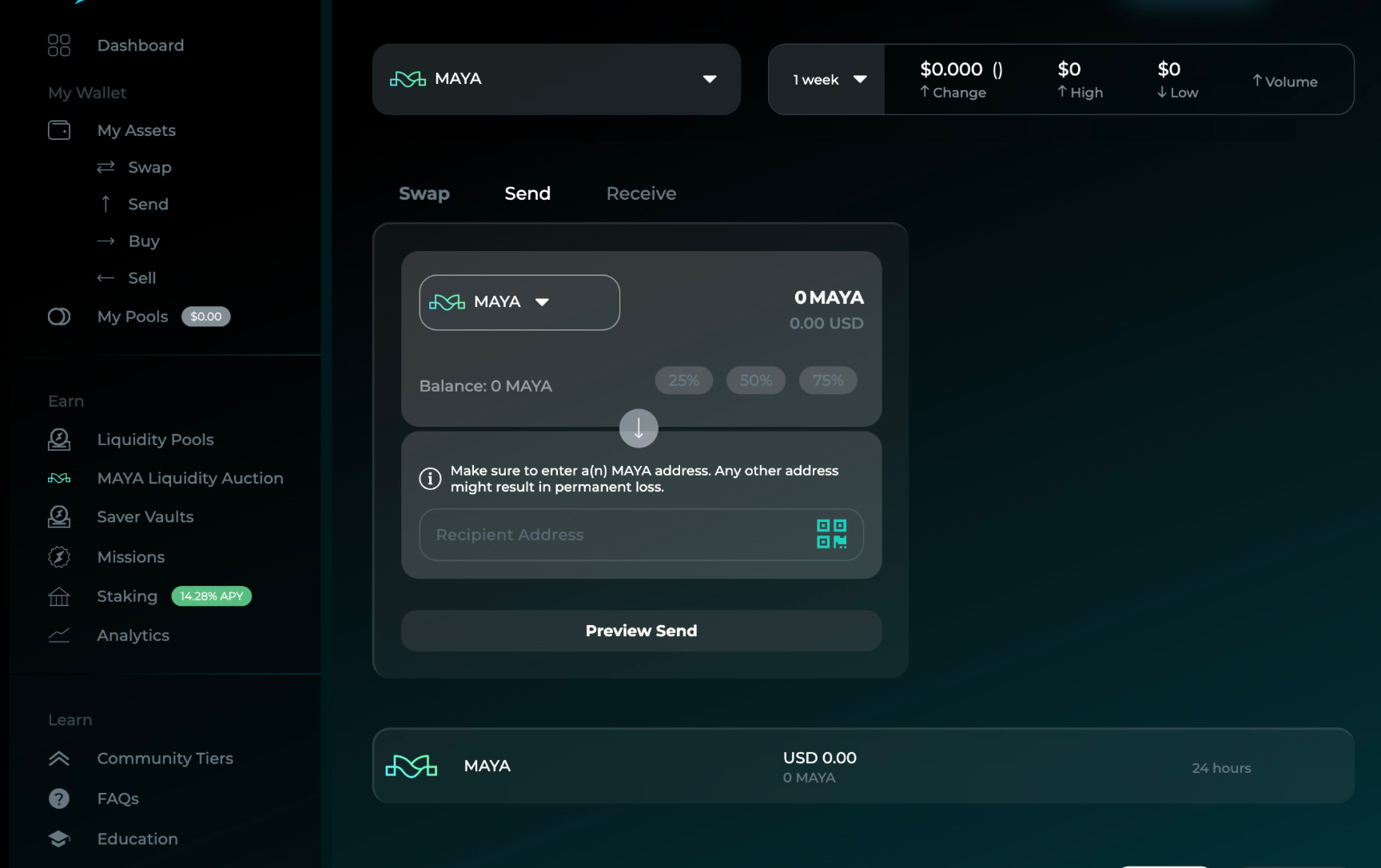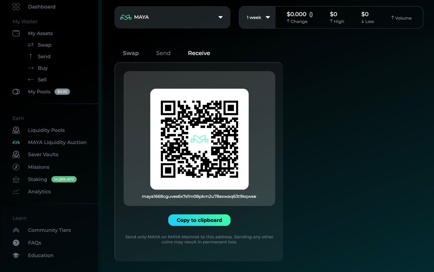 11\. Change the tab from "Send" to "Receive" - there, you will be able to copy your new Maya wallet address. It should begin with "maya..."