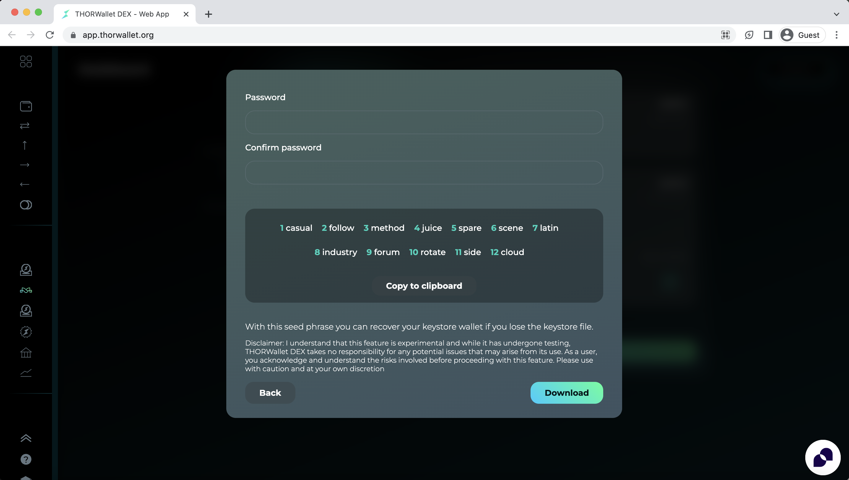 4\. Create and confirm a password for the keystore file. Make sure to save this password. You'll need it to open the keystore file. Make sure to save the 12-words seed phrase; you can use it to recover your wallet if you lose your keystore.