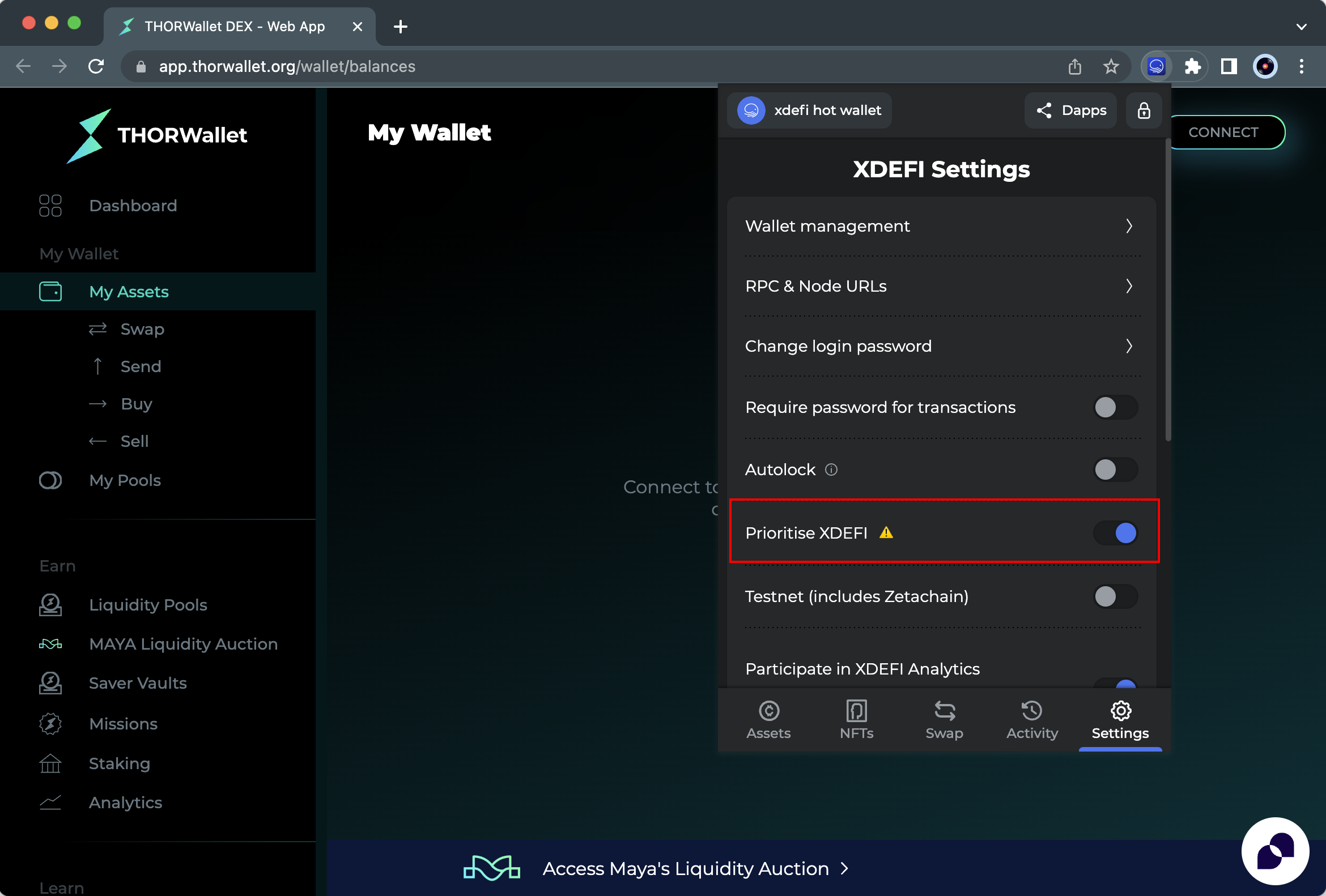 Create a new XDEFI wallet, or use an existing one. Make sure to “Prioritize XDEFI” in the settings.