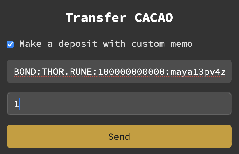 * Example: `UNBOND:THOR.RUNE:100000000000:maya13pv4zgyy85lzadjjkyvy3mmmr7l0yx9lzamay4`